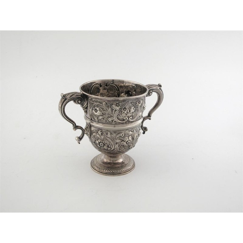 A George II two handled Irish cup, with later embossed decoration, vacant cartouche, by John Laughlin, Dublin c.1750, 5.1in (13cm_ high, 14oz.