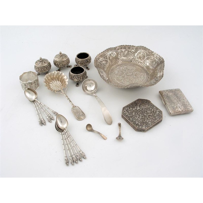 A Persian dish, a Chinese sugar sifter spoon, a continental cigarette case, a compact, a Chinese sauce ladle, a set of 10 Chinese teaspoons, a napkin ring and four Middle Eastern condiments with spoons, 27oz. (lot)