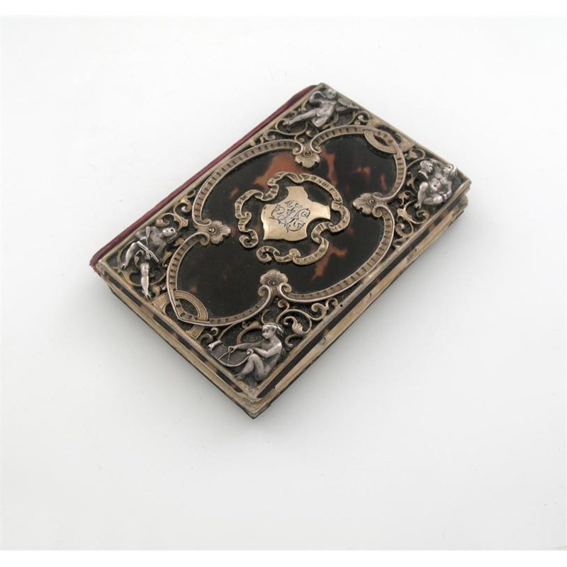 A 19th century French parcel gilt-mounted tortoiseshell aide memoire, with pencil and initialled, with putt, representing the arts circa 1870, 3.75in (9.5cm)