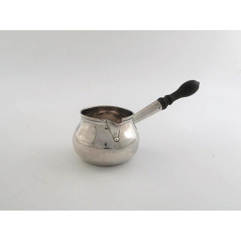 A George II brandy saucepan, with a squat , bellied bowl, lip spout and a mounted turned wooded handle, by Thomas Farren, London 1732, the bowl 4.5in (11.5cm) diameter, 12.5oz.