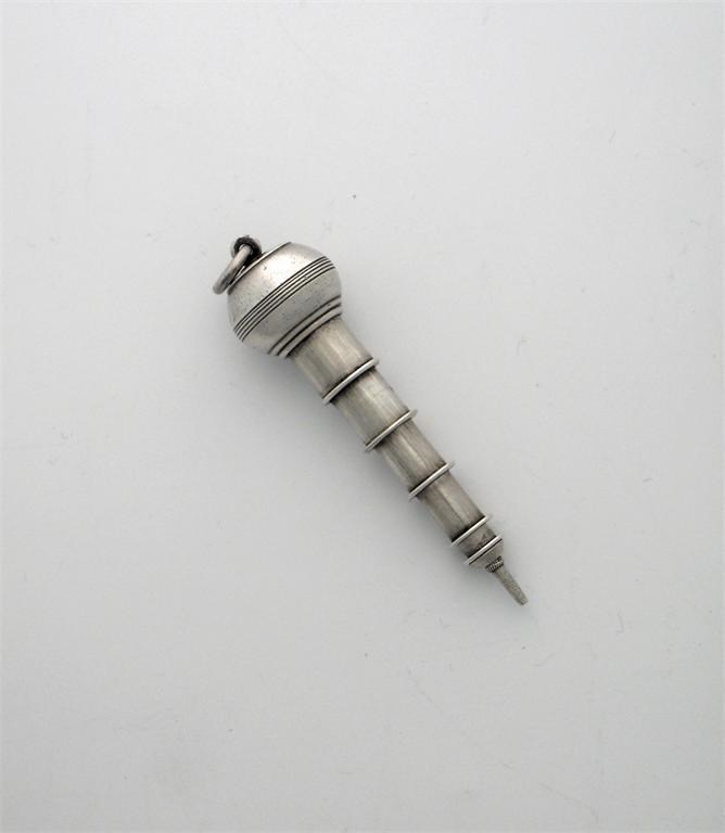 A novelty propelling pencil in the form of a telescopic plumb bob, with five graduated sections and suspension ring, by Samson Mordan & Co, No 2016, 3in (7.6cm) extended