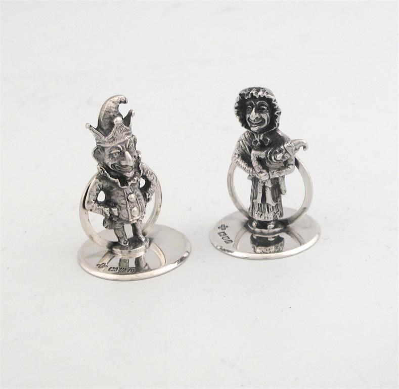 A pair of modern novelty menu holders, on disc bases, cast in the form of Punch & Judy, by Woodward & Co, London 1910, 2in (5cm) high, 2oz. (2)