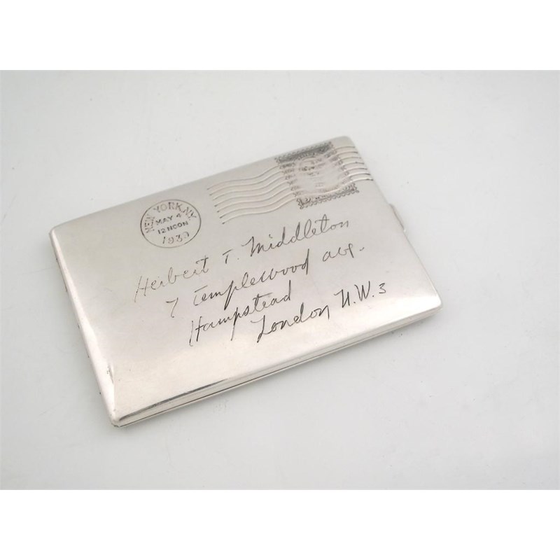 A 20th century American novelty cigarette case, resembling a facsimilie addressed, stamped and post marked envelope (from 'New York at 12 Noon on May 4th 1939', to 'Herbert T. Middleton, 7 Templewood Avenue, Hampstead, London NW3'), makers mark monogram 'CJ'?, c.1939, 4.45in (11.2cm) long, 4.5oz.