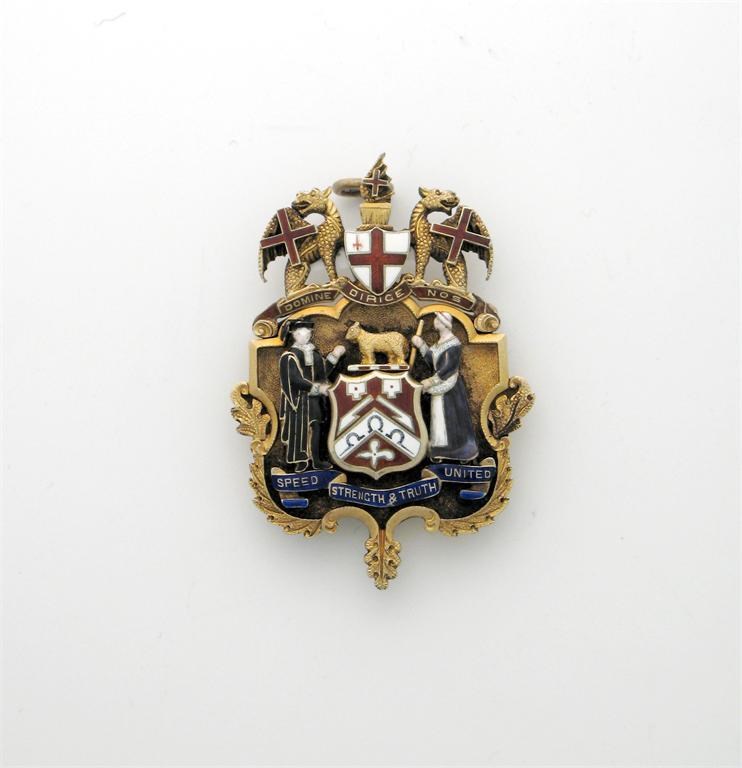 An Edward VII silver gilt and enamel pendant inscribed "Presented to Mr Deputy John James Baddeley J.P, Mastor of the Worshipful Company of Frame-Work Knitters 1906 - 7", 2.75in (7cm)