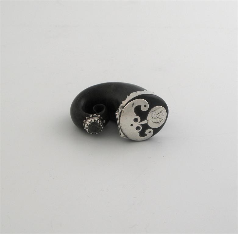 An early 19th century Scottish silver-moulded ram's horn snuff mull, gem set, the lid with initials CG, the rim inscribed Charles Grant above a shield with gardening trophies, 2.25in (5.8cm)
