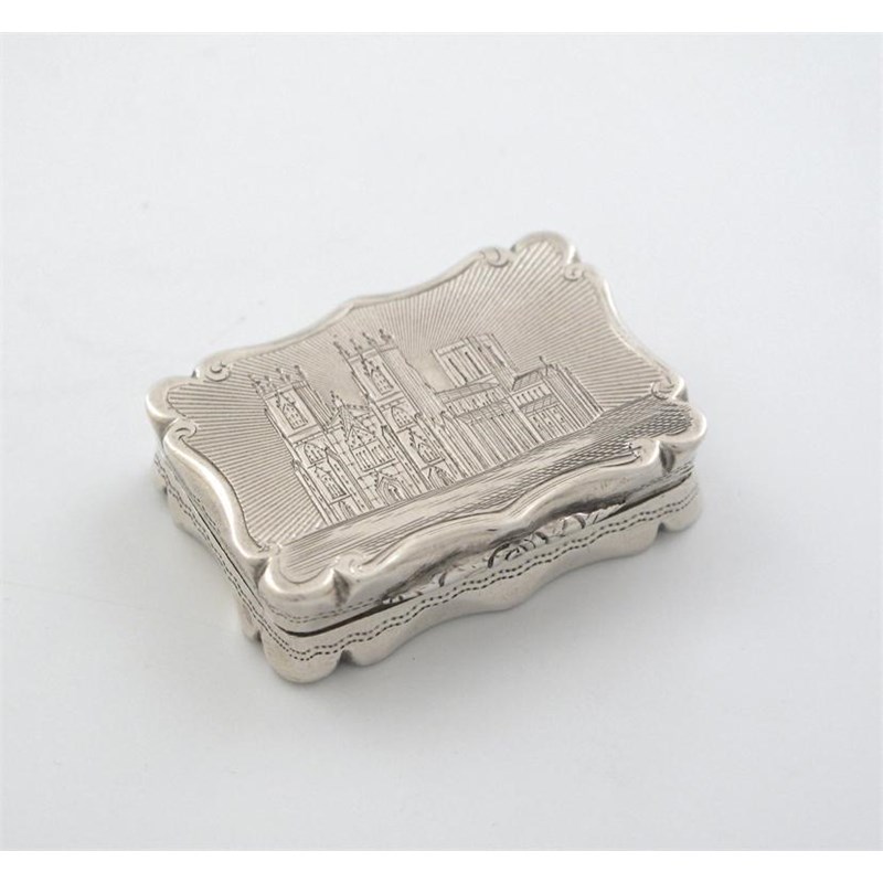 A Victorian engraved 'castletop' vinaigrette, of serpentine outline, with a view of York Minster, possibly by William Phillips, Birmingham 1853, 1.5in (3.8cm)