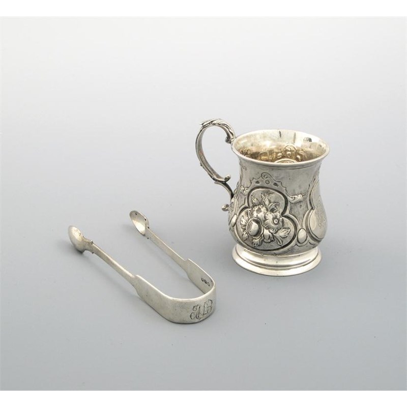 A Victorian small embossed mug, of squat baluster form, initialled, gilt interior, by Alfred Spark, London 1854 together with a pair of George III fiddle pattern sugartongs, the mug 3.5in (9cm) high, 5.75oz. (2)