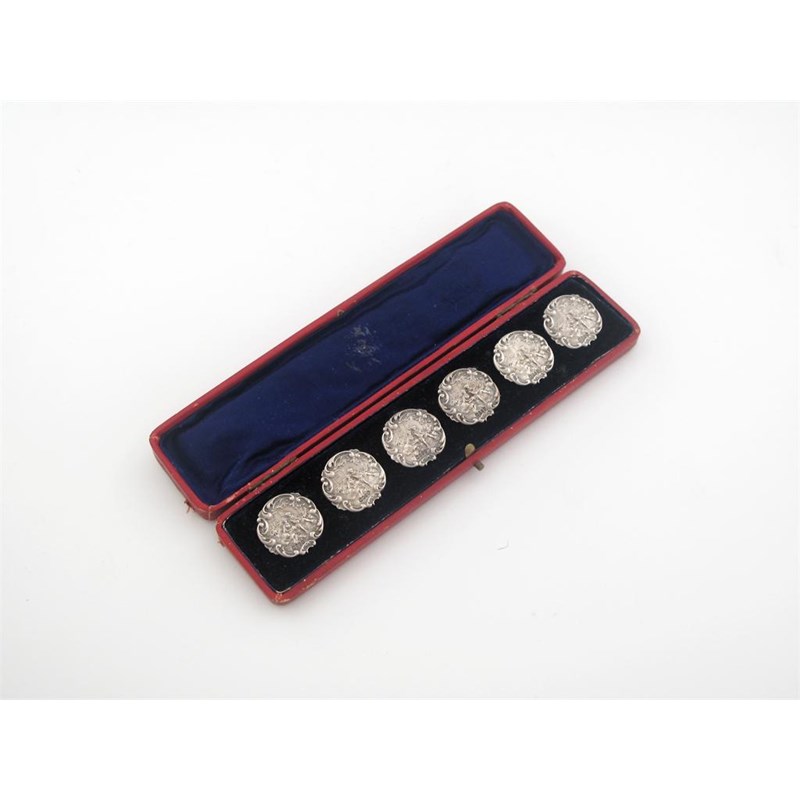 A cased set of six decorative buttons, each one depicting figures in a romantic setting, with English import mark for London 1903, 1in (2.5cm) diameter each, 1oz.