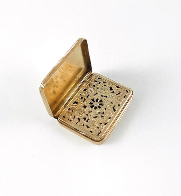 A George III silvergilt oblong vinaigrette, with a raised border of flowers and the applied letters "SOUVENIR", by Walter Williams, London 1819, 1.55in (4cm) long.