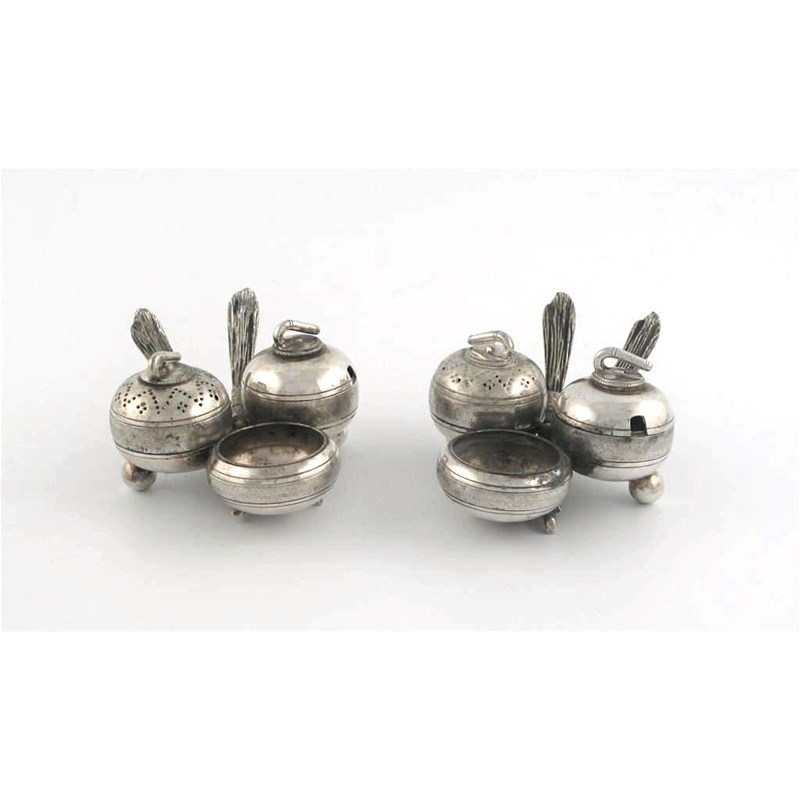 Sporting interest: A pair of plated breakfast condiments, each comprising salt, mustard and pepper in the form of curling stones.
