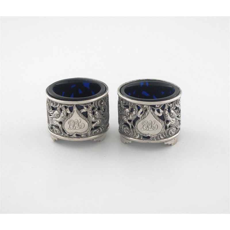 A pair of late 19th/early 20th century Chinese pierced circular salts, on bracket feet, blue glass liners, initalled, makers mark 'KL' and Chinese character mark, 1.8in (4.5cm) diameter, 2oz weighable silver. (2)