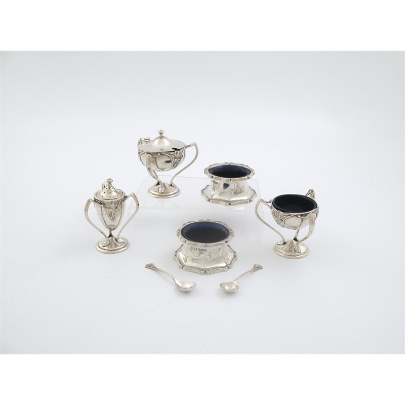 An Edwardian art nouveau, 3 piece condiment set with buttress supports comprising mustard and salt (blue glass liners), a pepperette and two matching spoons, by E.S. Barnsley Ltd, Birmingham 1906/1907 together with a pair of mern spool shaped salts (with blue glass liners) with petal shaped borders, Sheffield 1917, 9.5oz weighable silver. (7)