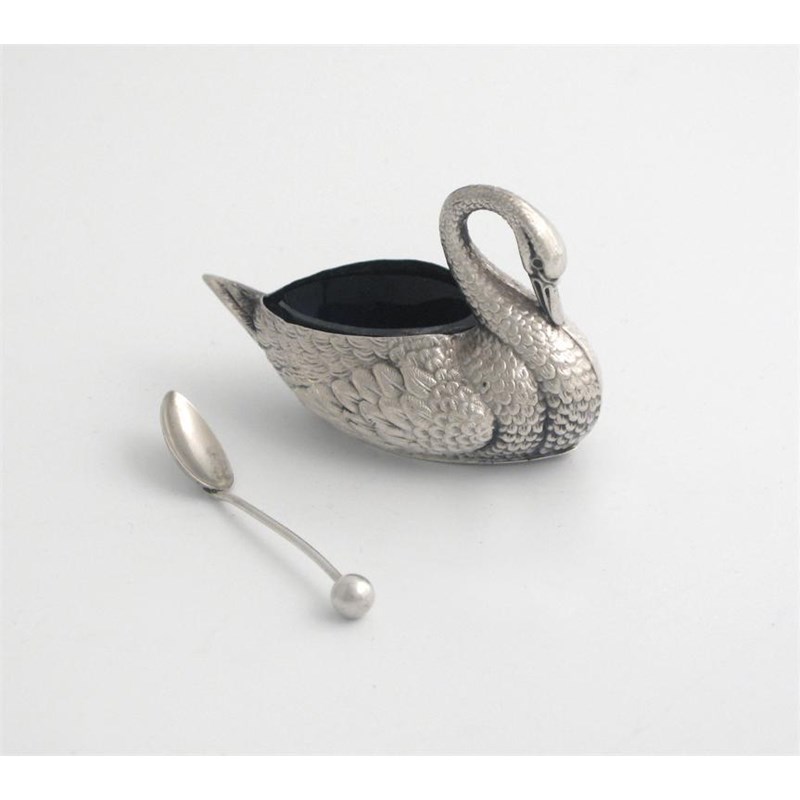 An Edwardian novelty salt, in the form of a swimming swan, with blue glass liner and matching spoon, by Adie & Lovekin, Bimringham 1907, 2.8in (7.2cm long, 0.5oz weighable silver,