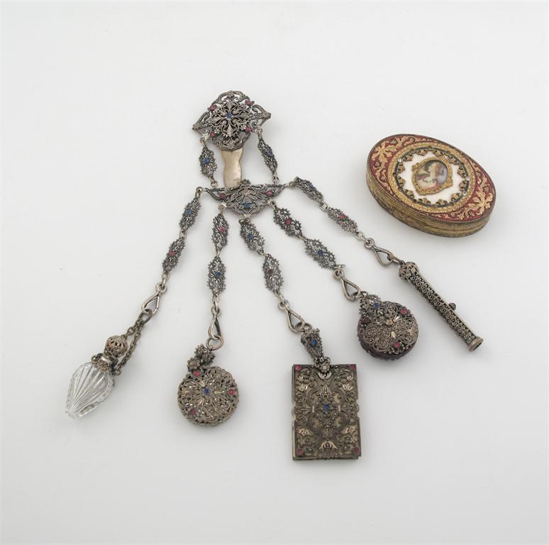 A late 19th century French plated chatelane, with an openwork clasp, set with coloured glass bosses, five chains and five fittings, dependant, together with a gilt metal oval compact box, the cover inset with a portrait miniature (behind glass), the latter 3.1in (8cm) long. (2)