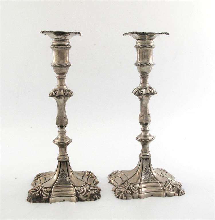 A pair of George II cast candlesticks, with knopped baluster columns and rising shaped square bases with shell decoration at the corners, engraved coat of arms and detachable, crested nozzles, incised scratchweights and numbers '2' & '4', by William Cox, London 1769, 9.8in (25cm) high, 34oz. (2)