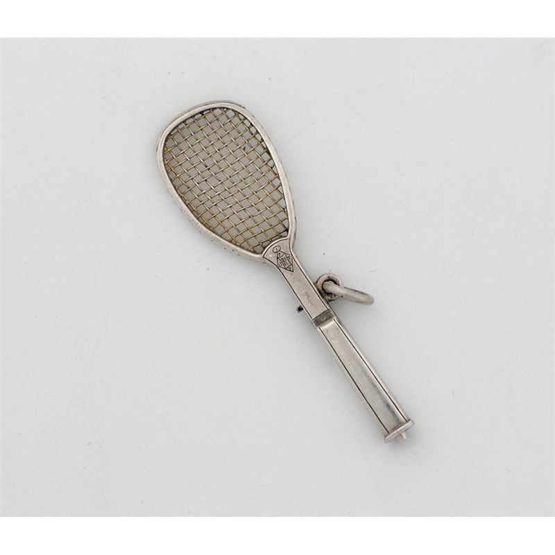 A rare Victorian telescopic pencil, in the form of a tennis racket, with incuse registered design lozenge and a French duty mark on the suspensory ring, c.1880, 2.5in (6.5cm) long.