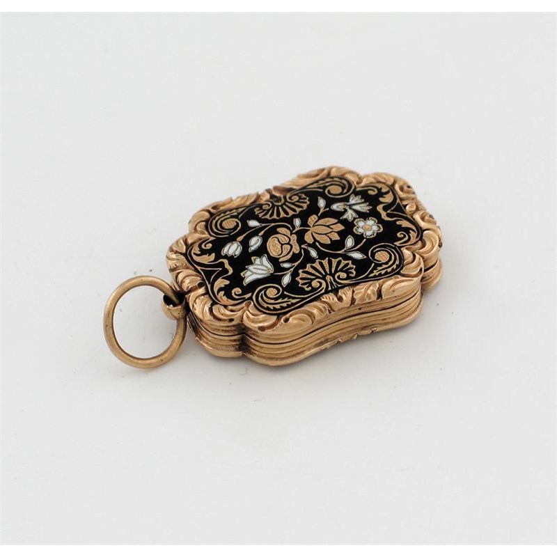 A mid 19th century Swiss vinaigrette, the cover and base with floral design in black and white enamel, leafage borders and suspension ring, 1.2in (3cm).