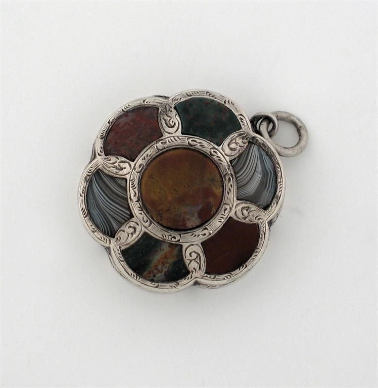 A Victorian lobed circular vinaigrette, the cover inset with seven agate panels, the base leaf engraved, suspension ring, by James Fenton, Birmingham 1857, 1.2in (3cm) diameter.
