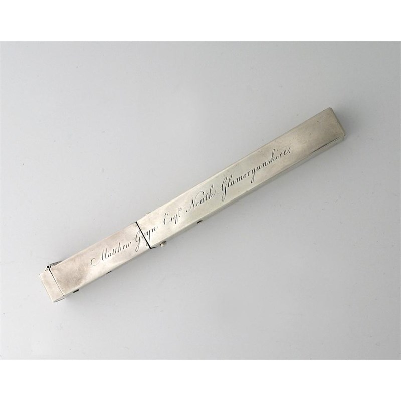 A George III sealing wax holder, of square section, seperating into two section (to take long wax and a stubby wax tablet), inscribed 'Matthew Gwyn Esq, Neath, Glamorganshire', by T.Phipps and E.Robinson, London 1804, 7in (18cm) long.