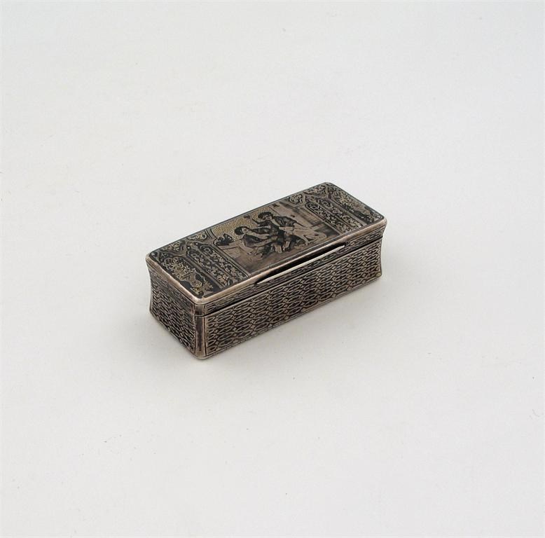 A 19th century French oblong niellowork box, with parcel gilding, two boys and a dog, makers mark 'JG', post 1838, 3.3in (8.5cm).