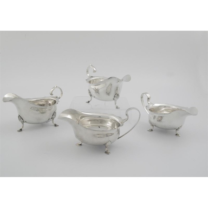 Two pairs of modern sauce boats: one pair by Stokes and Ireland, Chester 1936; the other pair slightly smaller, by Mappin & Webb, Sheffield 1935, 17oz. (4)