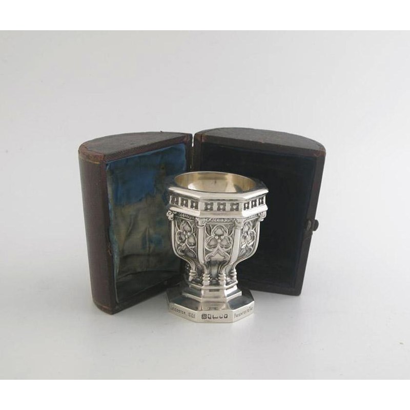 A Victorian salt, in the form of a Gothic font, inscribed 'Presented to a Rev. A. E. King, BA as a token of Affectionate Esreem by S. Mays, Young Mens Bible classes, Liecester 1885', by H.Wilkinson & Co, Sheffield 1884 (fitted case), 3.5in (9cm) high, 4.5oz.