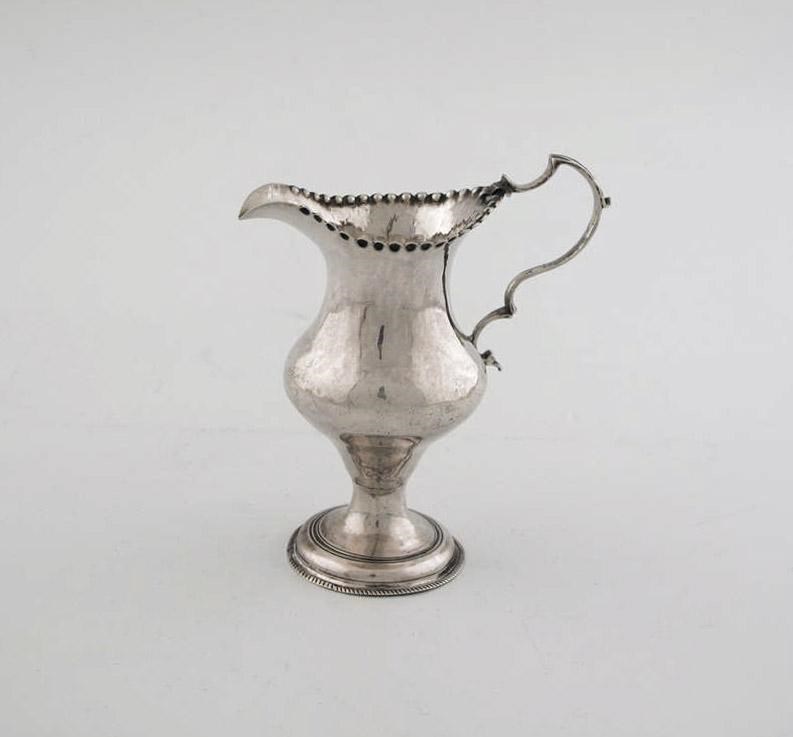 A George III baluster cream jug, with a punch beaded rim and pedestal foot, by Hester Bateman, London 1782, 4.75in (12.2cm) high, 2oz.