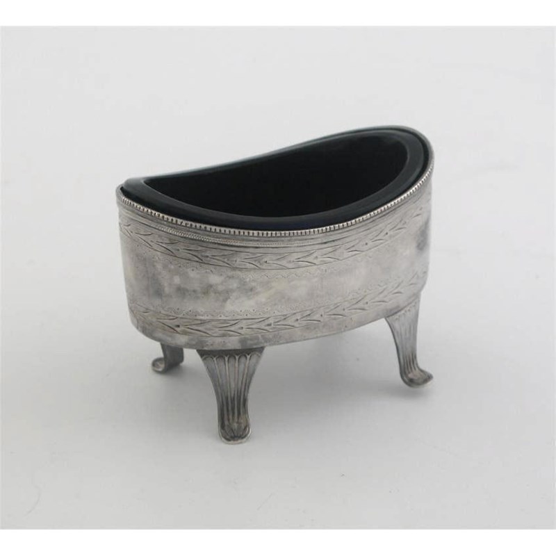 Channel Isles: a rare early 19th century bright-engraved oval salt, with a fine bead border and fluted feet, blue glass liner, the base initialled 'M.ALX' & 'NA', by George Hamon, Jersey c.1800, 3.1in (8cm), 3oz weighable silver.