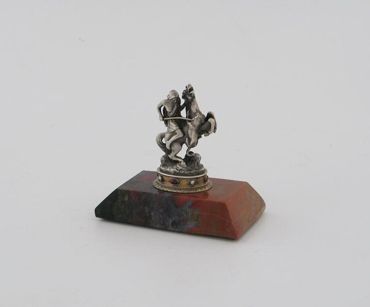 A rare 19th century French sculpted parcel gilt paperweight, on a bevelled coloured agate base, in the form of an Amazon on a rearing horse fighting off a lion, gems set base, signed 'WIESE.PARIS', for Jules Wiese 1870-75, 3.4in (8.5cm) high. *Jules Wiese (1818-1893) a chaser and jeweller and a pupil of Hossauer, a Berlin goldsmith, before working in Paris for Morel and then as head of Froment-Meurices workshop, after this he set up in business on his own account.