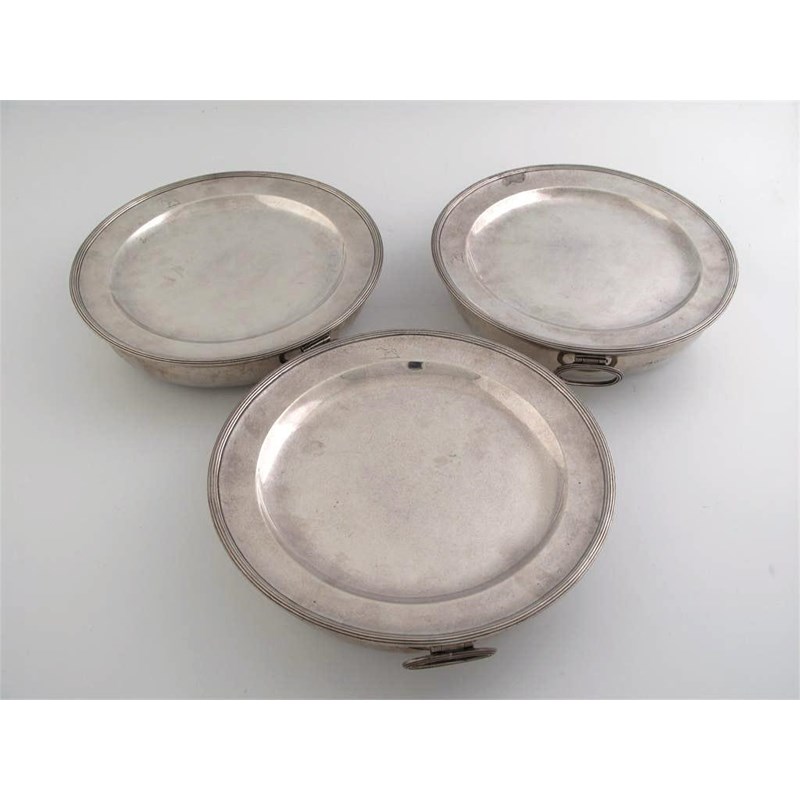 A set of three George III reeded circular dinner plates with matching warming bases, drop ring handles, crested, by Edward Fernell, London 1788/89, 9.5in (24cm) diameter, 96oz (3)