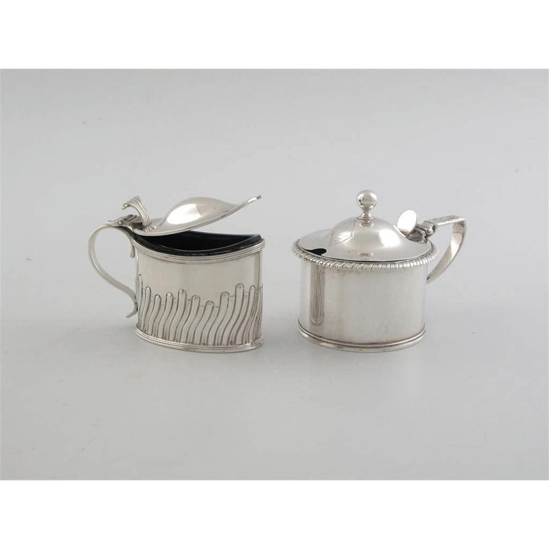 A George IV drum mustard pot with gadrooned border, the lid with armorial and ball finial, maker indistinct, London 1821, blue glass liner 4oz, also an oval mustard pot, part fluted, by Mappin & Webb, Sheffield 1898, blue glass liner. (2)
