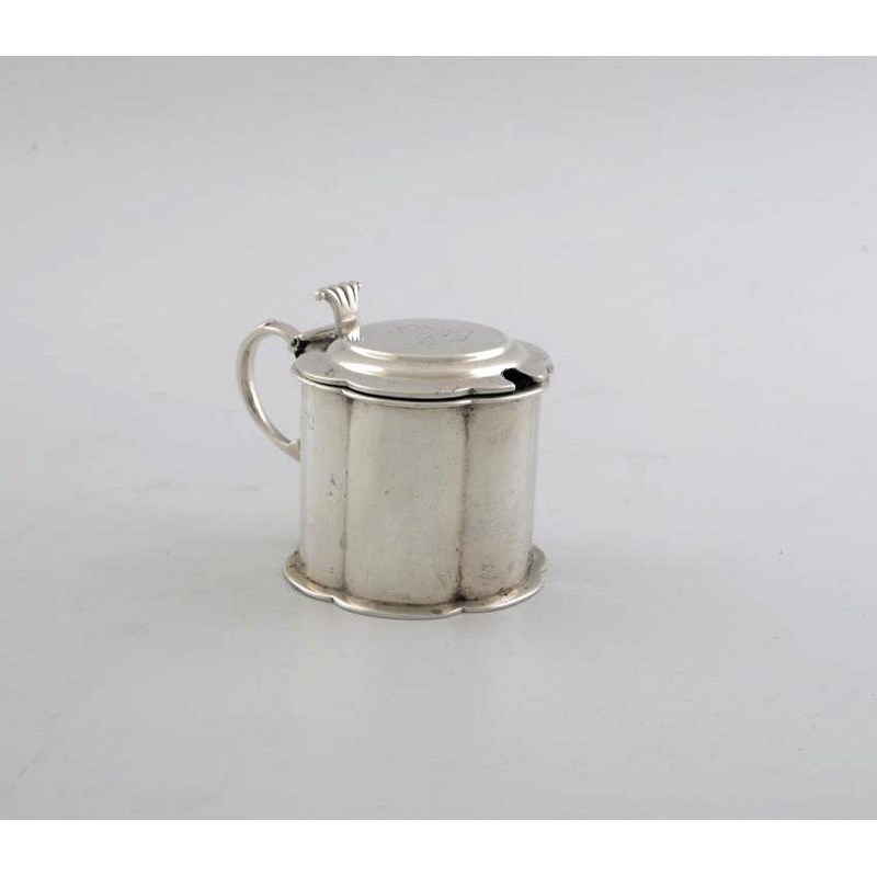 An Edwardian mustard pot, hexafoil the lid engraved and crest and motto, by F.A. Burridge, London 1904, blue glass liner. 4.5oz