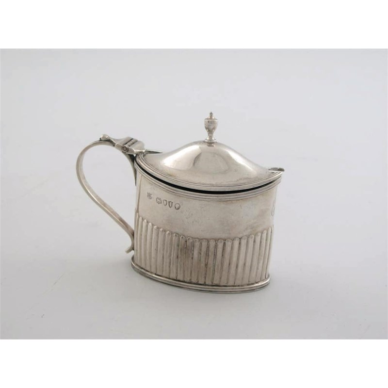 A Victorian oval mustard pot, Part fluted, with urn finial, by Boadbury Henderson London 1884, blue glass liner. 3ozs.