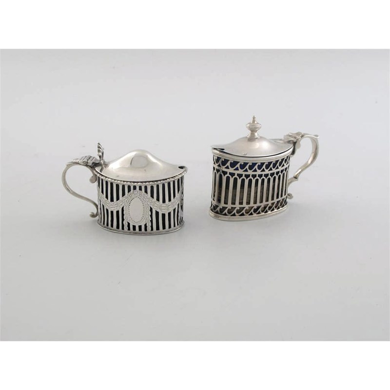 CRACKED LINER An oval mustard pot, fret, with laurel swags and gadrooned border, by Goldsmiths & Silversmiths Co. London 1910, blue glass liner, also an oval mustard pot, fret, with urn finial, by Walker and Tolhurst London 1892, cracked blue glass liner (2)