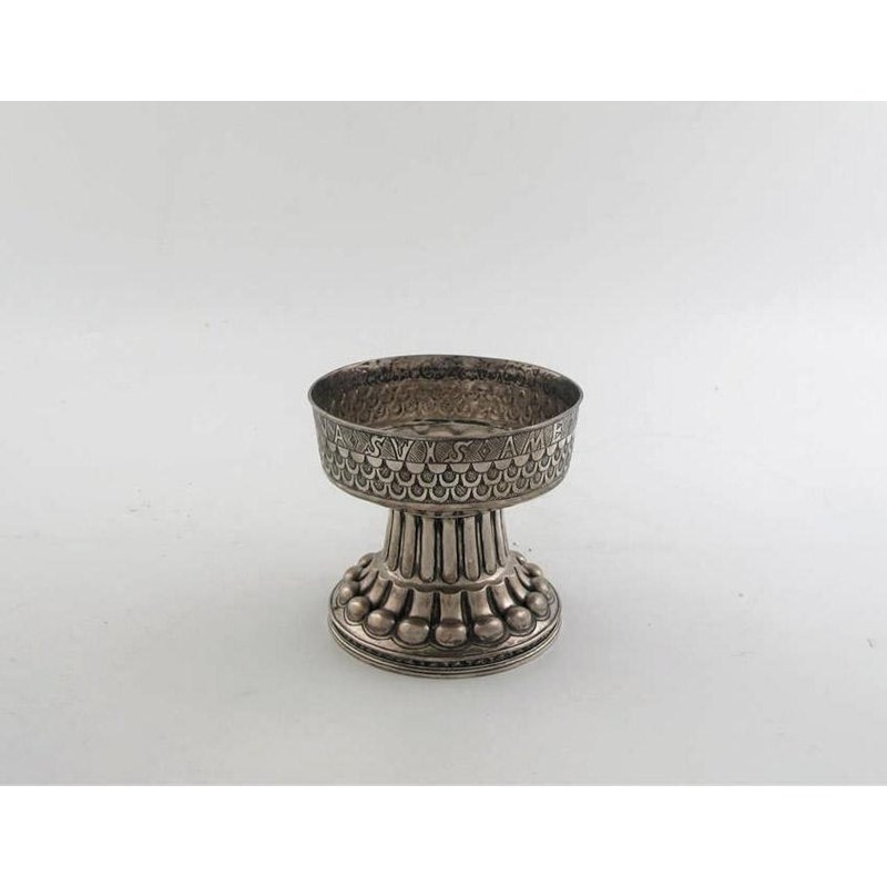 An Edwardian copy of a medieval font cup, with fluting and scale decoration and Lombardic inscription, by G Nathan & R. Hayes, Chester 1908, 4.1in (10.5cm) high, 11oz.