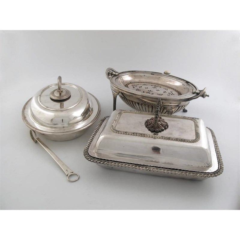 A small quantity of plated ware: a turnover dish on reeded supports, an oval entree dish and cover, an oblong entree dish and cover and a silver meat skewer by Thomas Ollivant (of Manchester) A/F.