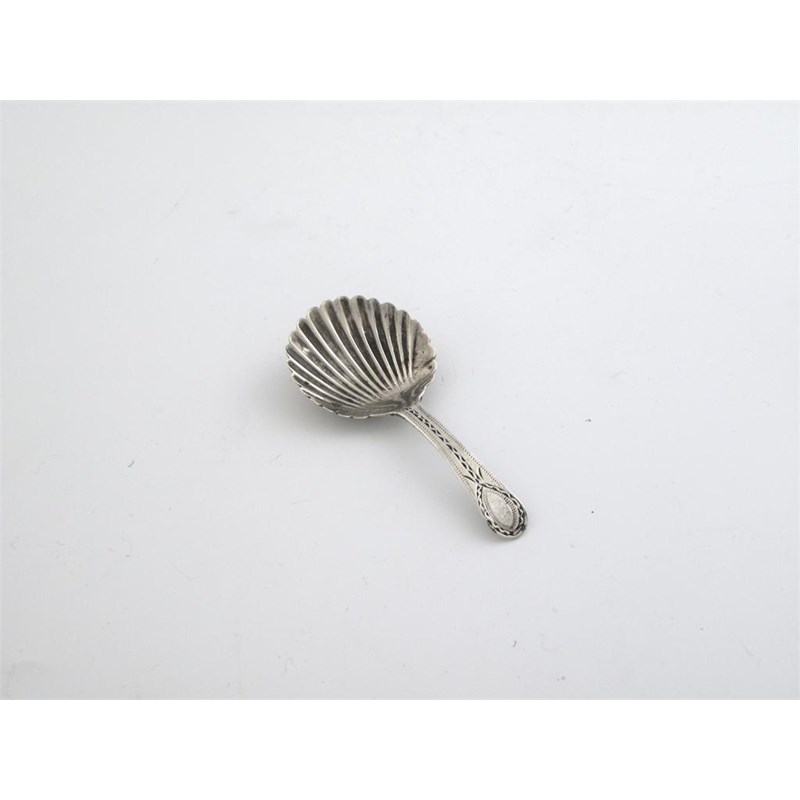 A George III provincial caddy spoon, shell bowl and bright cut stem, by Jason Holt, Exeter 1790.