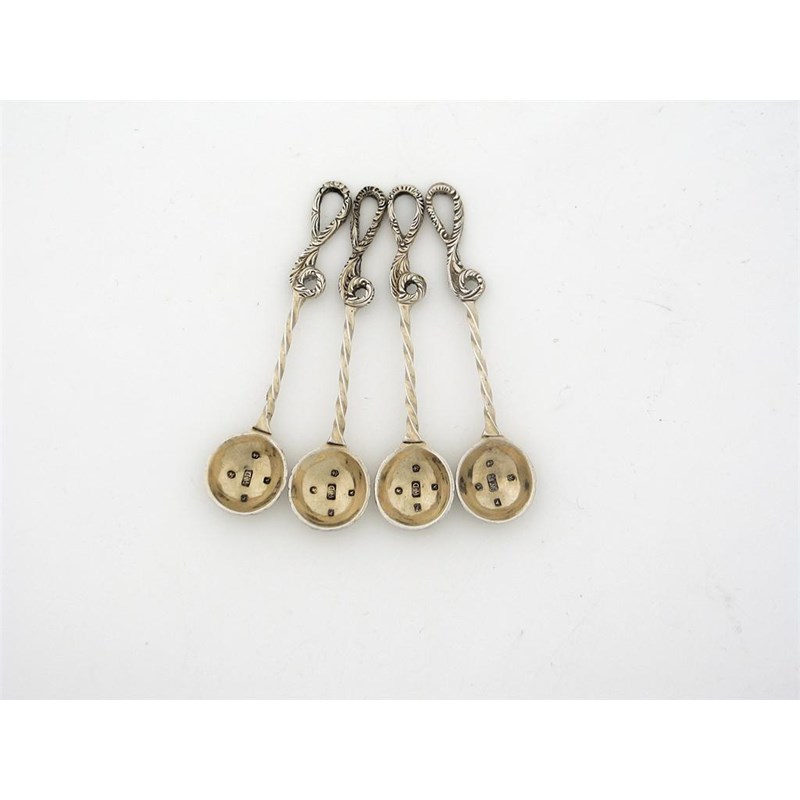 A set of four Victorian silver gilt salt spoons, the twist stems with looped whip terminals, shell bowls, by William Dudley, Birmingham 1849. (4)