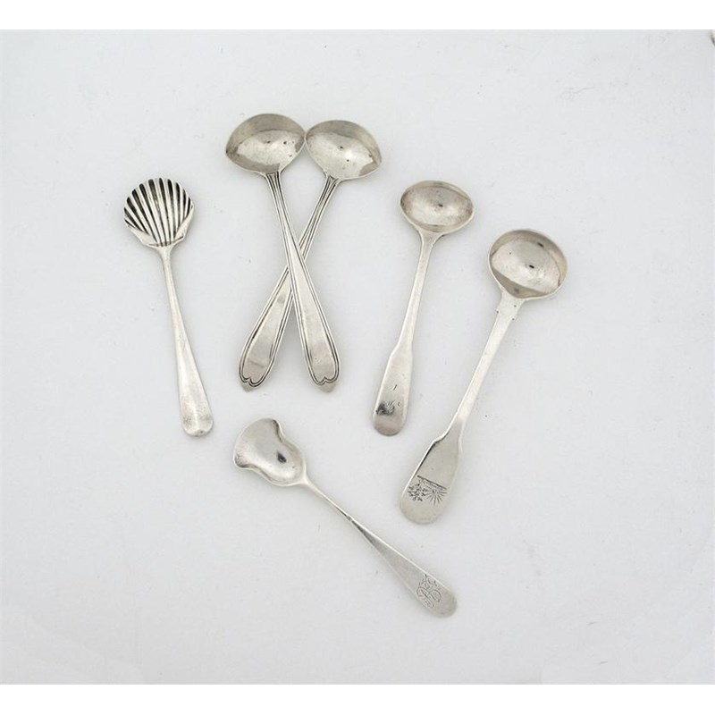 A pair of George III Irish salt spoons, boat shaped bowls and reeded pointed handles, by John Dalrymple, Dublin 1800, another by David Gray, Dumfires, a shell bowl salt spoon, by James Tookey, London 1750, a fiddle pattern example by Barber and North, York 1835 and a shovel bowl salt spoon, c.1760. (6)