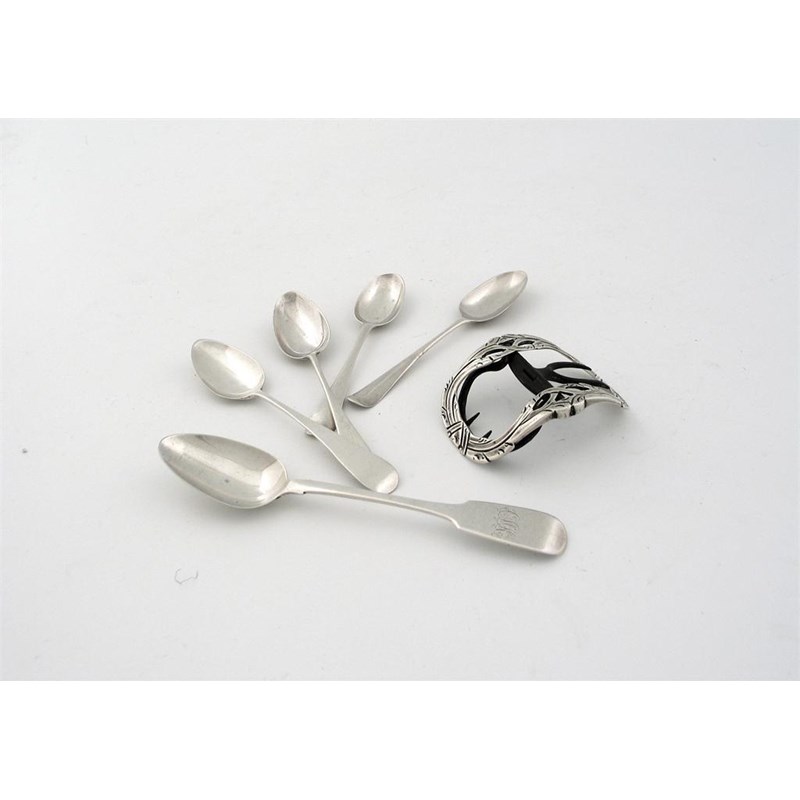 Two George III teaspoons, Newcastle, two others, George II and another fiddle pattern, Dublin 1838 also a buckle, makers mark only 'AR', c.1760. (6)