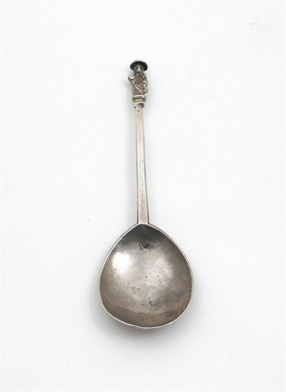 A Charles I apostle spoon: St PETER, the gilt figure with sacred dove nimbus and key, the back of the bowl pricked 'PB' over '1649' over 'RR', by Robert Jygges, London 1628, 6.8in (17.3cm) long, 1.25oz.