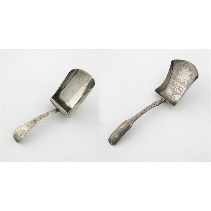 A George III engraved caddy scoop, with a hollow Fiddle stem, initialled 'ED', by Joseph Taylor, Birmingham 1811 and a George III caddy spoon, plain with a Fiddle stem, initialled 'S', by Samuel Pemberton, Birmingham 1806. (2)