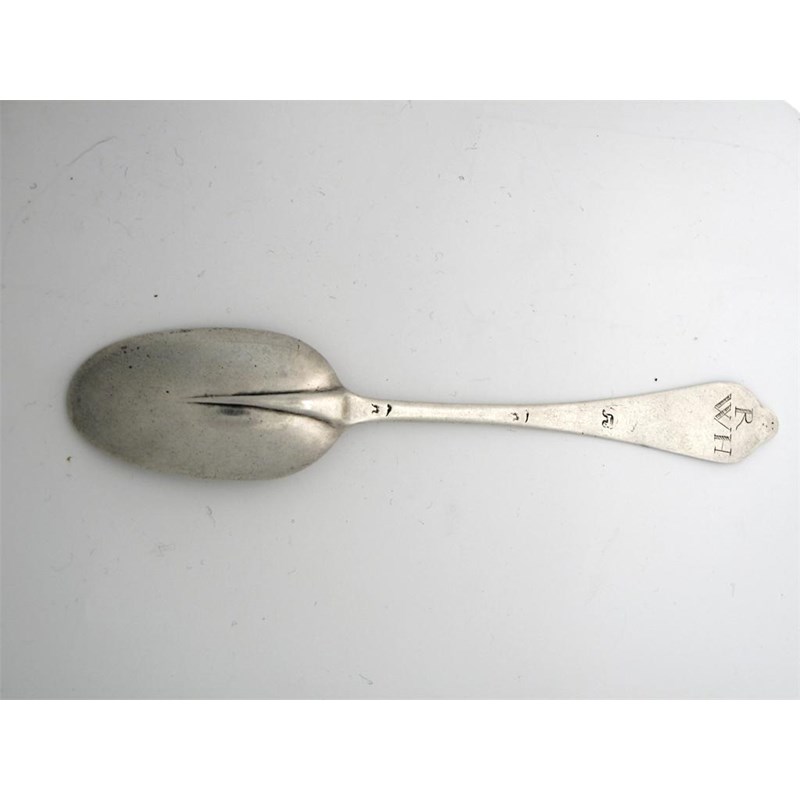 A Queen Anne unascribed provincial wavy end spoon, plain rattail bowl, scratched initials 'R' over 'WH' struck thrice with an indistinct mark (a gold fleece?), c.1705, 8in (20.2cm) long, 1.25oz.