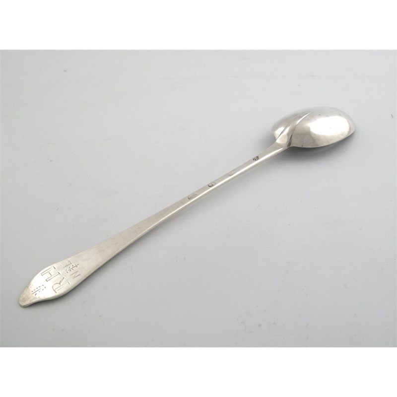 A Queen Anne rat tail basting spoon, the dog nose terminal engraved N L and on the back R H and N L, by William Scarlett, London 1706, 12.4in (31.5cm) 3.7oz