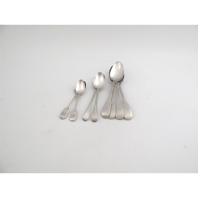 4 FIDDLE TABLESPOONS, 2 DESSERT SPOONS & 2 TEASPOONS (8) Four 19th Century Chinese export Fiddle tablespoons, by Kheechong, a pair of Exeter-made Fiddle teaspoons and a pair of George III dessert spoons, 11oz. (8)