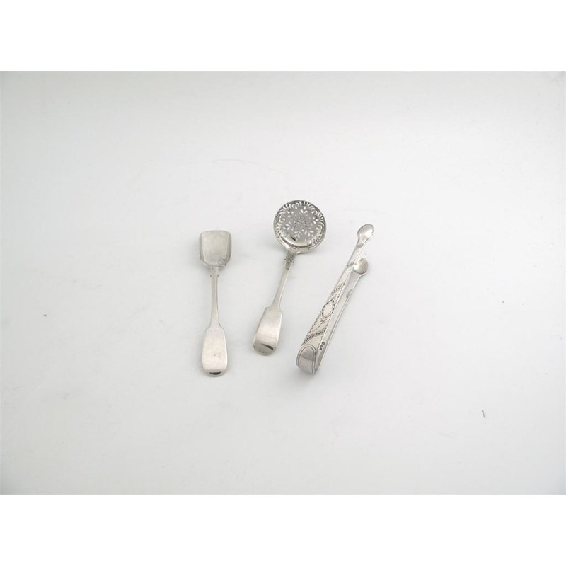 A pair of George III bright cut sugar tongs, by George Day, London 1800, fiddle pattern sugar spoon, by Thomas Stone, Exeter 1866 and a fiddle pattern stilton cheese scoop, by Francis Higgins, London 1890, 4oz. (3)