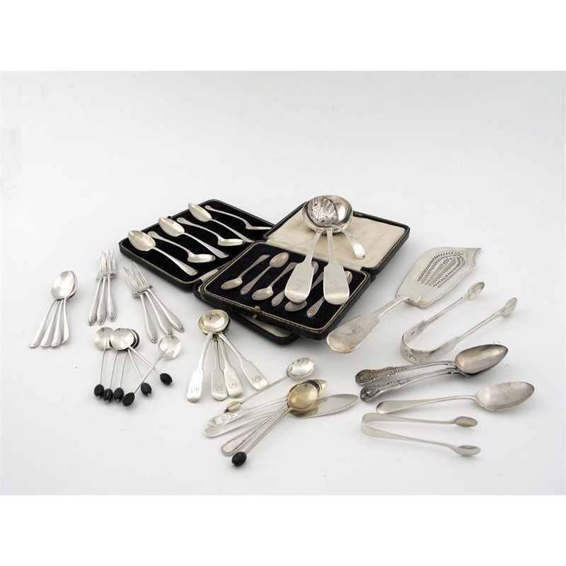 Miscellaneous flatware including: a Victorian fiddle fish slice and a pair of sauce ladles, initialled and crested to match, by William Eaton, London 1837/41, a cased set o 6 coffee spoons, a cased set of 6 teaspoons, a set of cake forks, 2 pairs of sugar tongs a set of four Victorian salt spoons and 19 other various items, 26oz weighable silver.