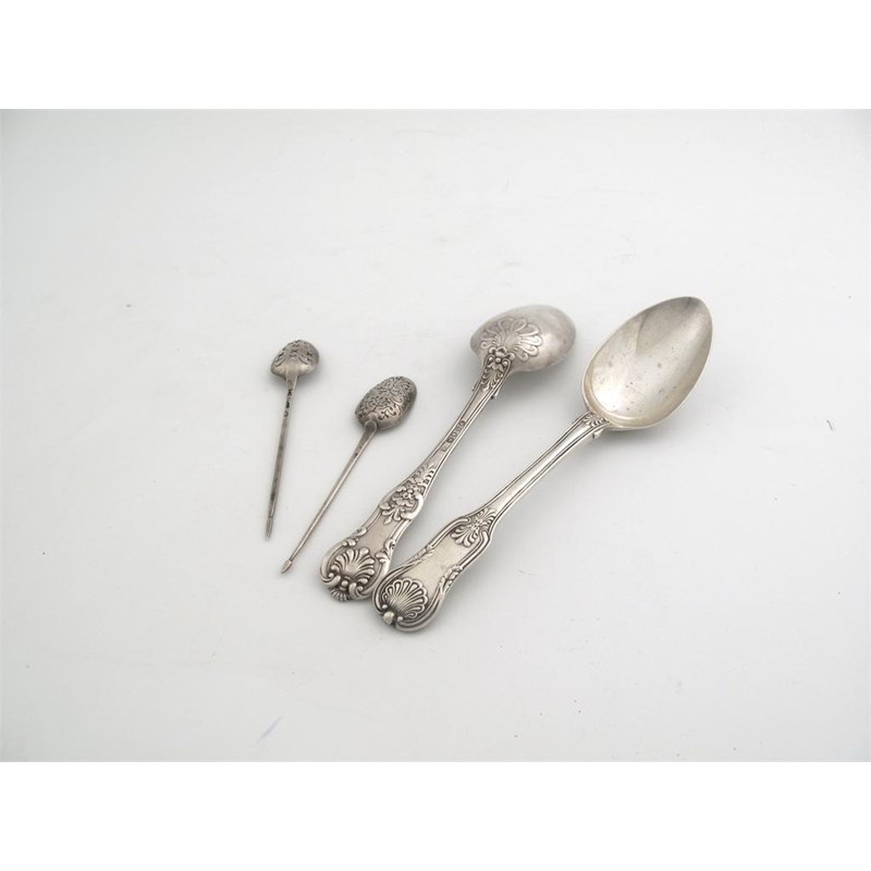 A George III Irish mote spoon, by John Shields, Dublin, a George III mote spoon and two tablespoons, 8oz. (4)