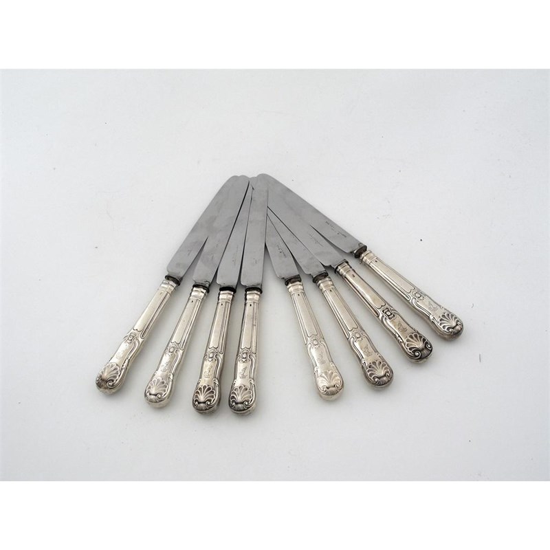 By Paul Storr: a set of 6 George III hourglass pattern tableknives, crested, London 1820 together with a pair of Victorian knives to match, by Francis Higgins, London 1844 (polished steel, finger point blades). (8)