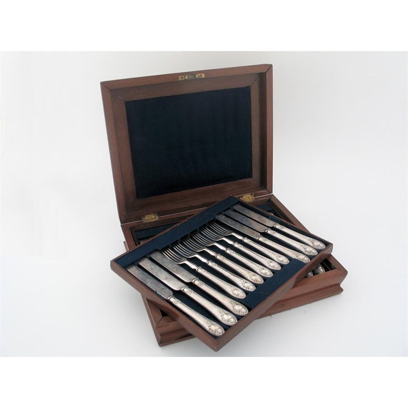A Victorian cased set of 18 pairs of dessert knives and forks